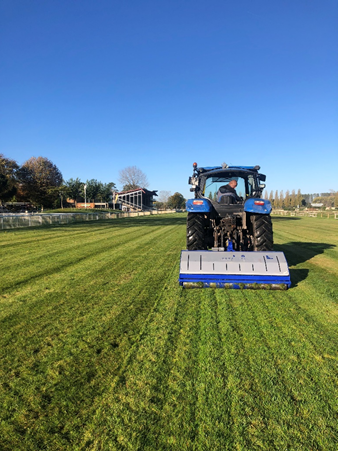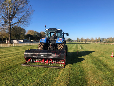 - Un décompactage en profondeur pour casser la croute de compaction empêchant l’eau de pénétrer dans le sol afin de favoriser l’enracinement de l’herbe grâce à un sursemis.